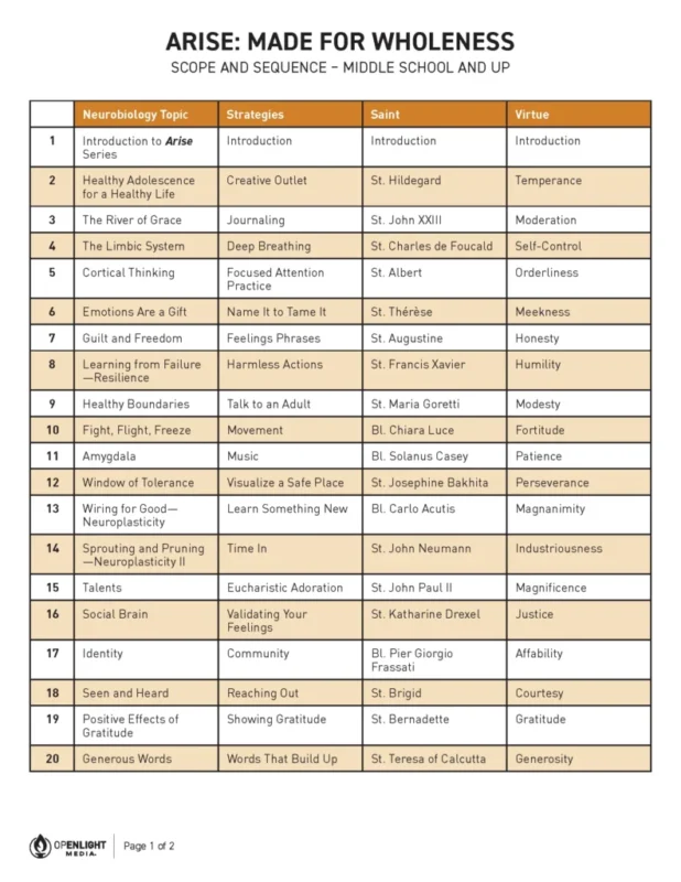 Arise invites middle and high school students to actively participate in understanding and growing their own minds, helping them develop secure relationships, a strong sense of agency, and the ability to reflect on their own thoughts and emotions. Combining insights from neurobiology with the Catholic call to holiness, Arise equips students and the adults who guide them to navigate adolescence with confidence, growing toward happiness, wholeness, and purpose.