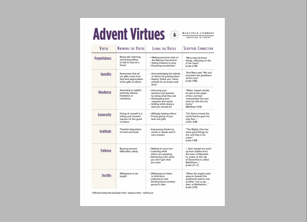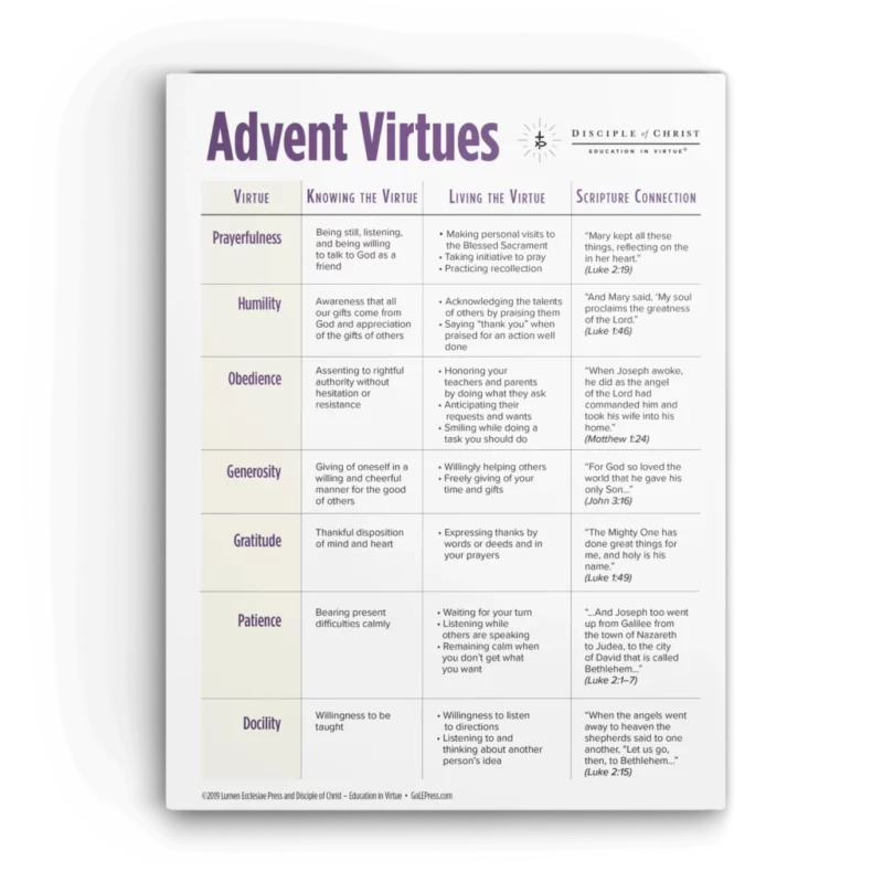 In the season of Advent, we join with Mary in preparing the manger of our hearts to receive the Christ Child. By cultivating the virtues, we seek to adopt the attitude of expectancy that Mary and the Chosen People of Israel have, as they waited in joyful hope for the coming of the Messiah. This download lists suggested virtues to practice and offers a connection to Scripture.