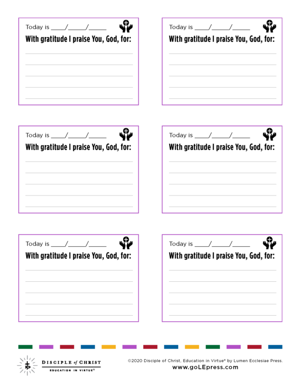 Gratitude is part of the virtue of justice. We are happy when we realize we owe so much to God and others and express this gratitude in our words and actions. Our fast-paced world gives us little time to reflect; we have to “make space” to recognize the blessings. Giving your students a gratitude log as part of their religion homework, bell-work, or an exit ticket on their day helps them develop the habit of living in gratitude.