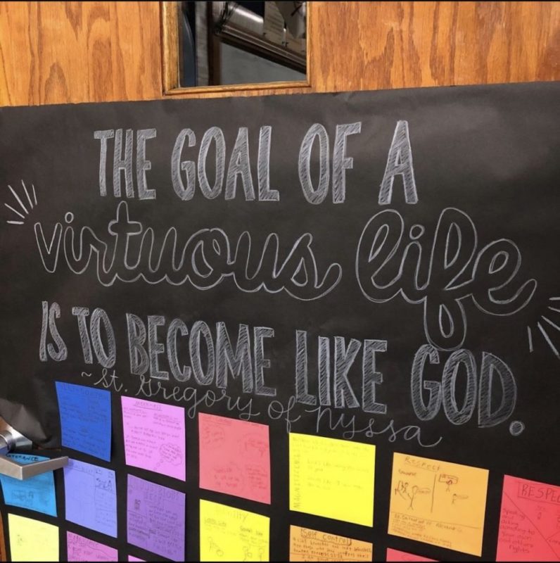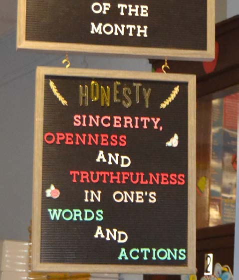 We promote the virtue of the month on our campus with signs, bulletin boards, and bingo.