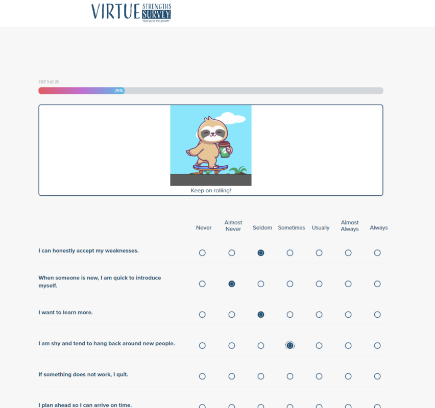 I really liked seeing the … virtues ranked from best to worst for me because it showed me my strengths and it helped me celebrate my virtues more yet has also showed me the ones I need to think about more and improve on. This survey was a very effective tool in helping me learn what virtues define my personality right now and how I can incorporate the other virtues in my life as well….